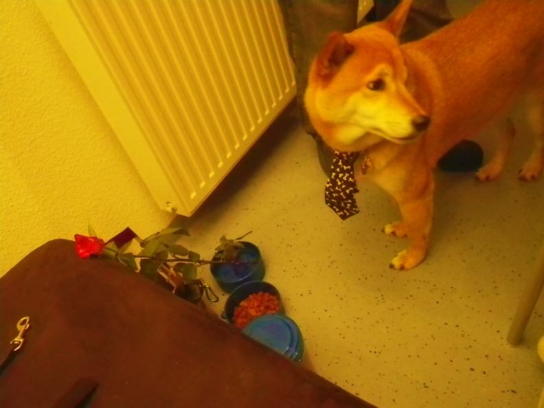 水飲み皿にバラ活けてたら、クンクン鳴かれた。