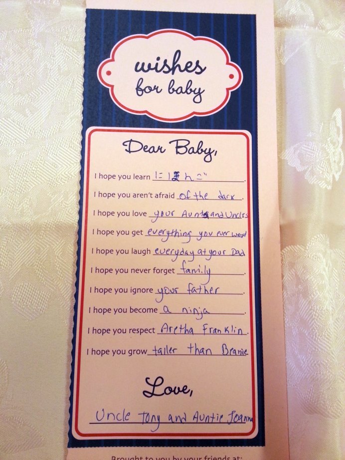 じぇの双子の弟トニーと奥さんのジョアンナが書いてくれたWishes For Baby。